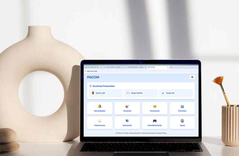 PACOM es una web app gratuita diseñada para ayudar a personas con parálisis cerebral y movilidad reducida a comunicarse de forma más sencilla mediante la selección de opciones en pantalla que se convierten en voz. El usuario selecciona una opción en la pantalla y PACOM la verbaliza automáticamente mediante síntesis de voz, sin necesidad de contacto físico.